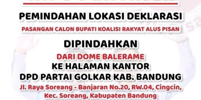 Semula, Deklarasi Koalisi Partai Golkar dan PKS yang mengusung Sahrul dan Gun Gun ini akan digelar di Dome Bale Rame Kompleks Gedung Budaya Sabilulungan, Soreang, pada hari ini Kamis (29/8/2024) mulai pukul 13.00-18.00 WIB.