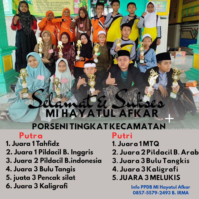 MI HAYATUL AFKAR menorehkan prestasi gemilang dalam ajang seleksi Pekan Olahraga dan Seni (Porseni) Tingkat Kecamatan Balongpanggang yang digelar pada tgl 25-26/04/2025. kemarin.