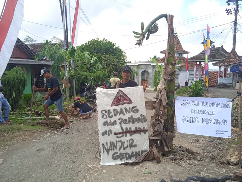 Sepanjang 1,3 kilometer jalan penghubung antara Dusun Ngipik dan Dusun Ngemplaksari, warga menanam pohon pisang sebagai bentuk protes. Ini bukan sekadar aksi teatrikal. Ini adalah jeritan nurani yang tak lagi bisa ditahan. Seorang warga, SK, menyuarakan kekecewaannya: