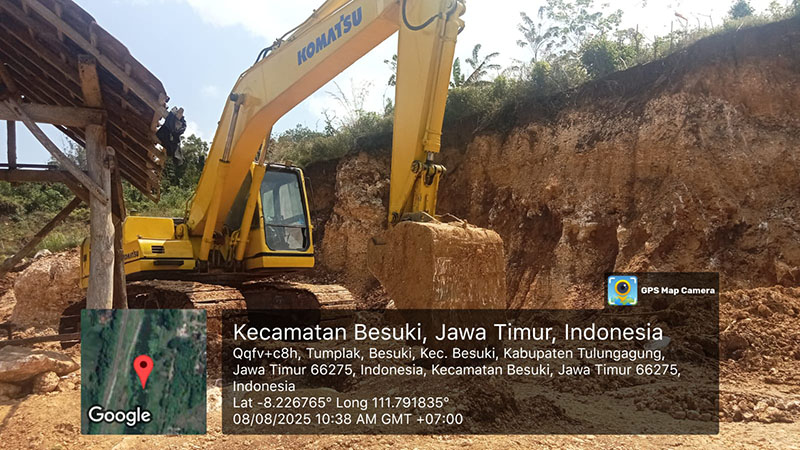 – Aktivitas tambang ilegal hanya berjarak dua meter dari jalan raya JLS Besuki, menggunakan alat berat berwarna kuning bermerek Komatsu.