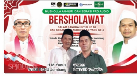 JOMBANG | SPJNEWS.ID – Dalam rangka memperingati HUT ke-80 Republik Indonesia sekaligus Milad ke-4, Serasi Pro Audio bersama Musholla An-Nur menggelar Bersholawat pada Kamis (14/8/2025). Kegiatan berlangsung khidmat dengan rangkaian pengajian, lantunan sholawat, dan tausiyah, menghadirkan nuansa religius yang kental.