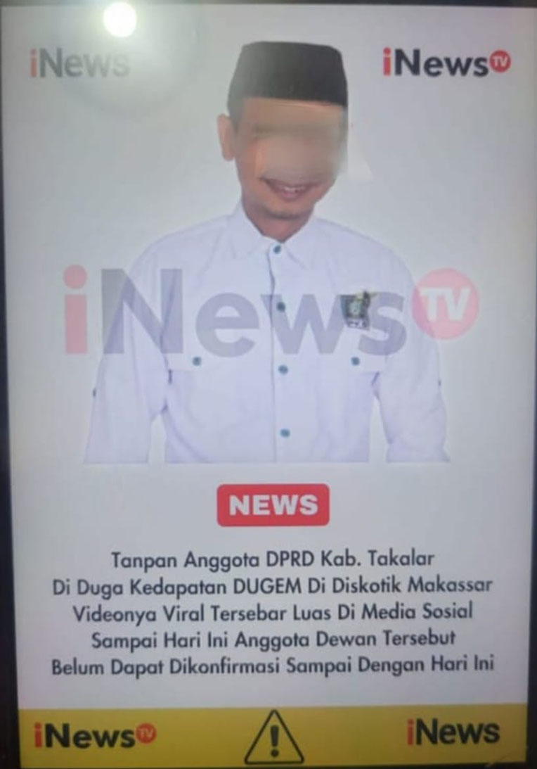 TAKALAR – Sebuah pamflet berlogo iNewsTV yang beredar di media sosial menimbulkan kehebohan di lingkup DPRD Kabupaten Takalar. Pamflet tersebut memuat tulisan sensasional yang menyebut seorang anggota DPRD “diduga kedapatan dugem di diskotik Makassar” dan “videonya viral”, namun tanpa konfirmasi kepada pihak yang disebut.