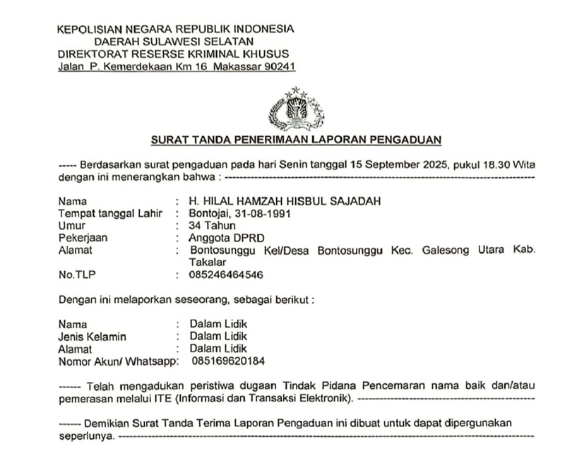 Merasa nama baiknya dicemarkan, anggota DPRD Takalar Fraksi PKB H. Hilal Hamzah Hisbul Sajadah menempuh jalur hukum. Ia melaporkan pemilik nomor WhatsApp yang mengirim pamflet tersebut ke Polda Sulawesi Selatan pada 15 September 2025.