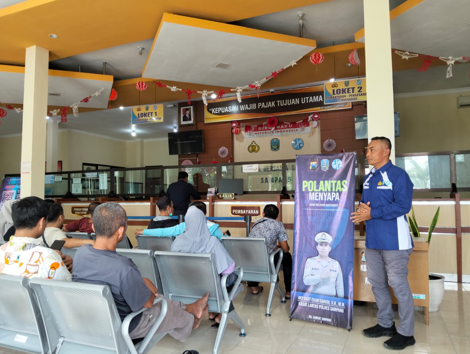 Dalam program “Polantas Menyapa”, Satlantas Polres Sampang gencar melaksanakan sosialisasi kepada masyarakat, masyarakat wajib pajak dan Masyarakat pemohon SIM di Satpas Polres Sampang.